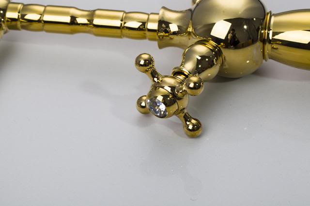 - De voet van deze gouden kraan heeft een keramieke afwerking( wit met een motief)