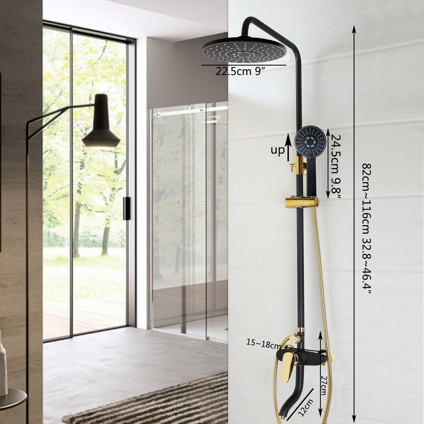 - De set is in hoogte verstelbaar van 82 - 116 CM (u kunt tijdens het installeren de bovenste stang dieper in de onderste stang drukken. Gebruik een heel klein beetje olie(zonnebloemolie bijvoorbeeld) om het iets gemakkelijker te verkleinen).