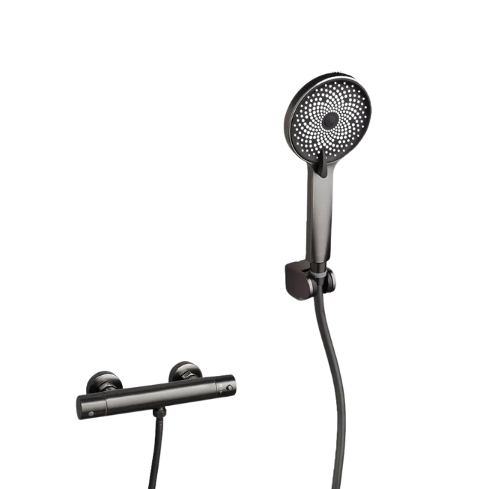 Deze complete set omvat alle benodigde onderdelen voor een gemakkelijke installatie en biedt een moderne, strakke uitstraling. De handdouche met drie straalstanden en de betrouwbare thermostatische werking zorgen voor een comfortabele douche-ervaring. Voeg deze gun metal douchekraan set toe aan uw badkamer voor een elegante en functionele upgrade.