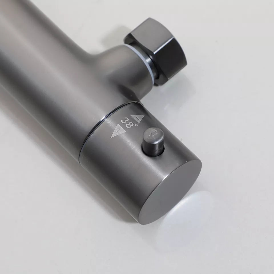 Upgrade uw badkamer met deze stijlvolle thermostatische douchekraan set in een luxe gun metal PVD-afwerking. De set biedt een perfecte combinatie van design, functionaliteit en duurzaamheid.