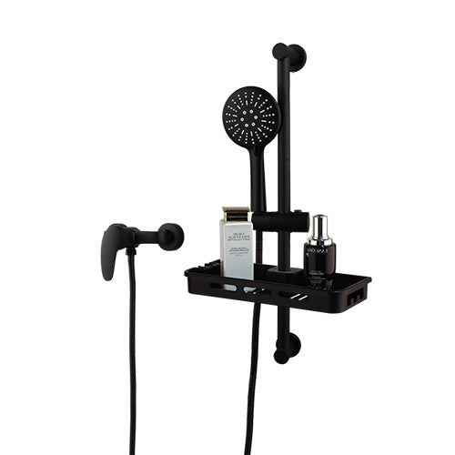 Zwarte douchekraan met glijstang en shampoo bak