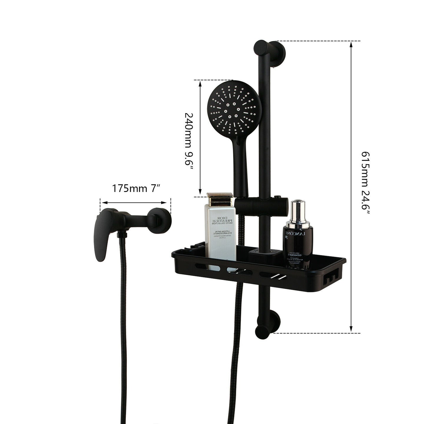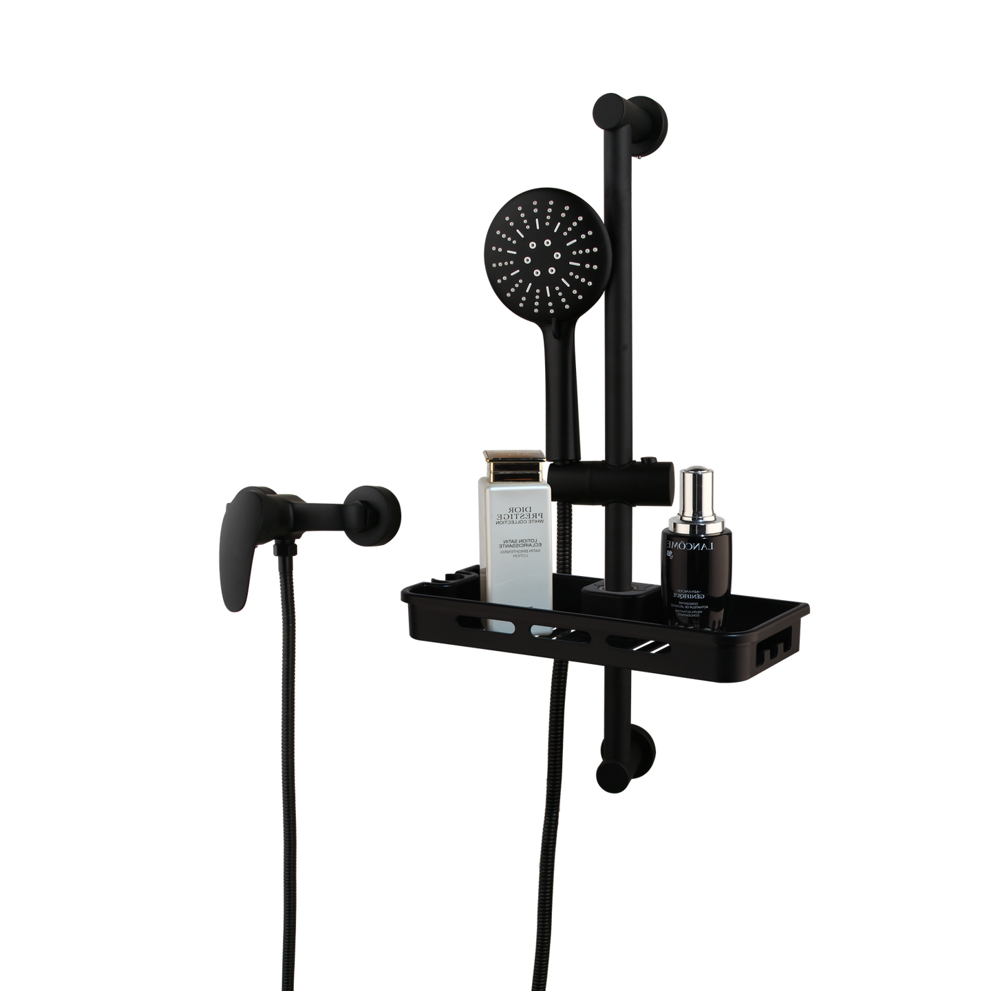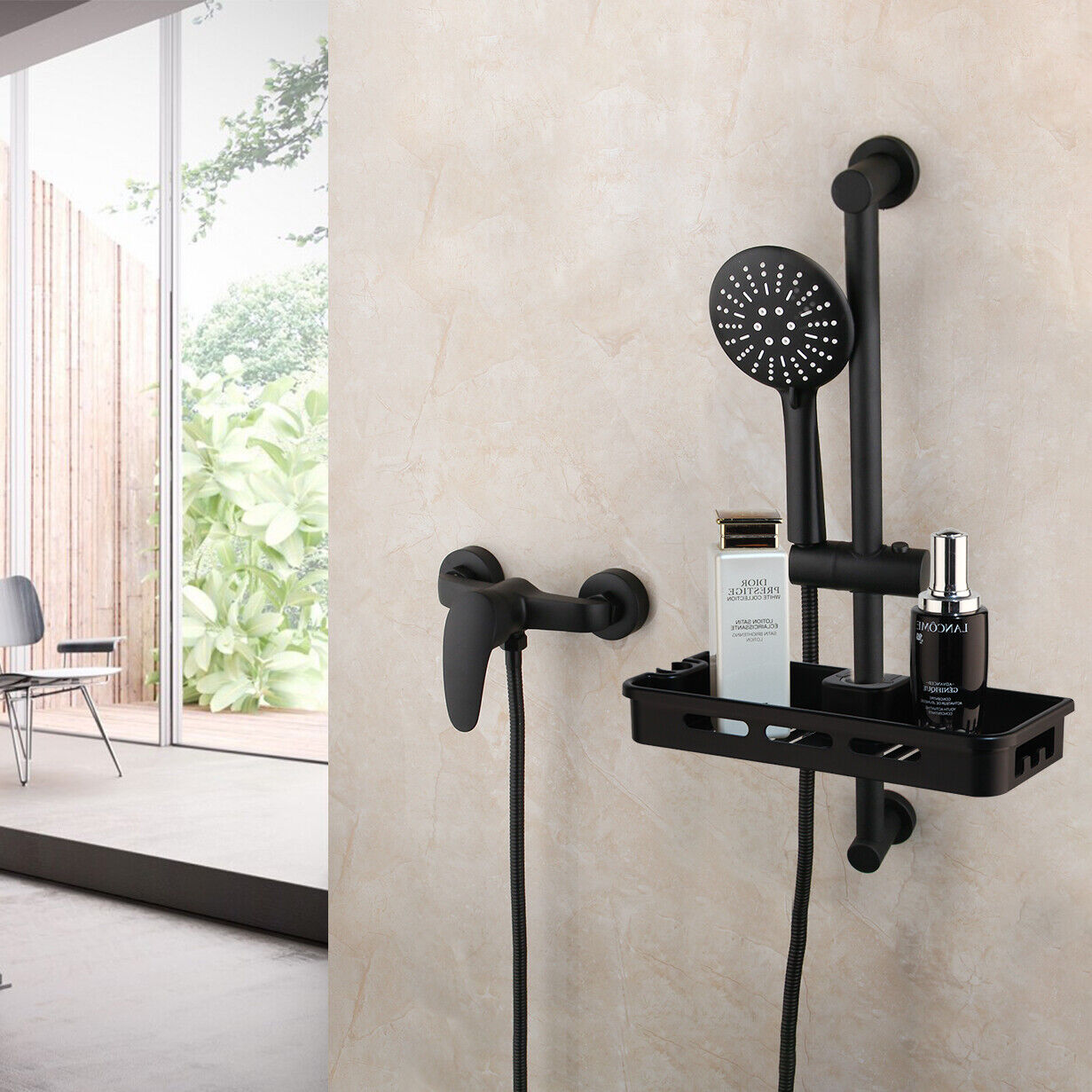 - Zwarte douchekraan met glijstang en shampoo bak