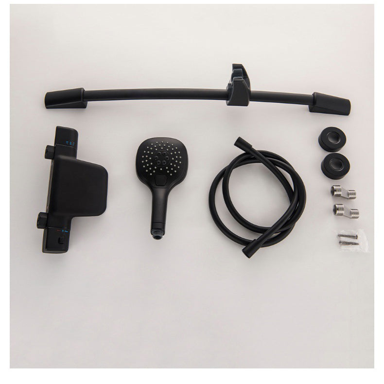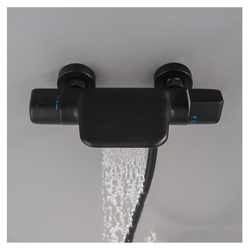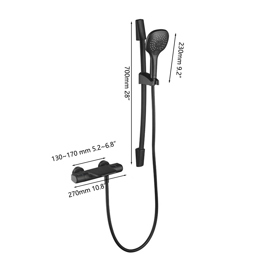 Deze moderne zwarte thermostatische badkraan biedt een veilige en comfortabele douche-ervaring dankzij de 38°C temperatuurbeveiliging en de nauwkeurige bediening. De set wordt compleet geleverd met handdouche, doucheslang en een verstelbare glijstang, zodat je de handdouche eenvoudig op de gewenste hoogte kunt positioneren.