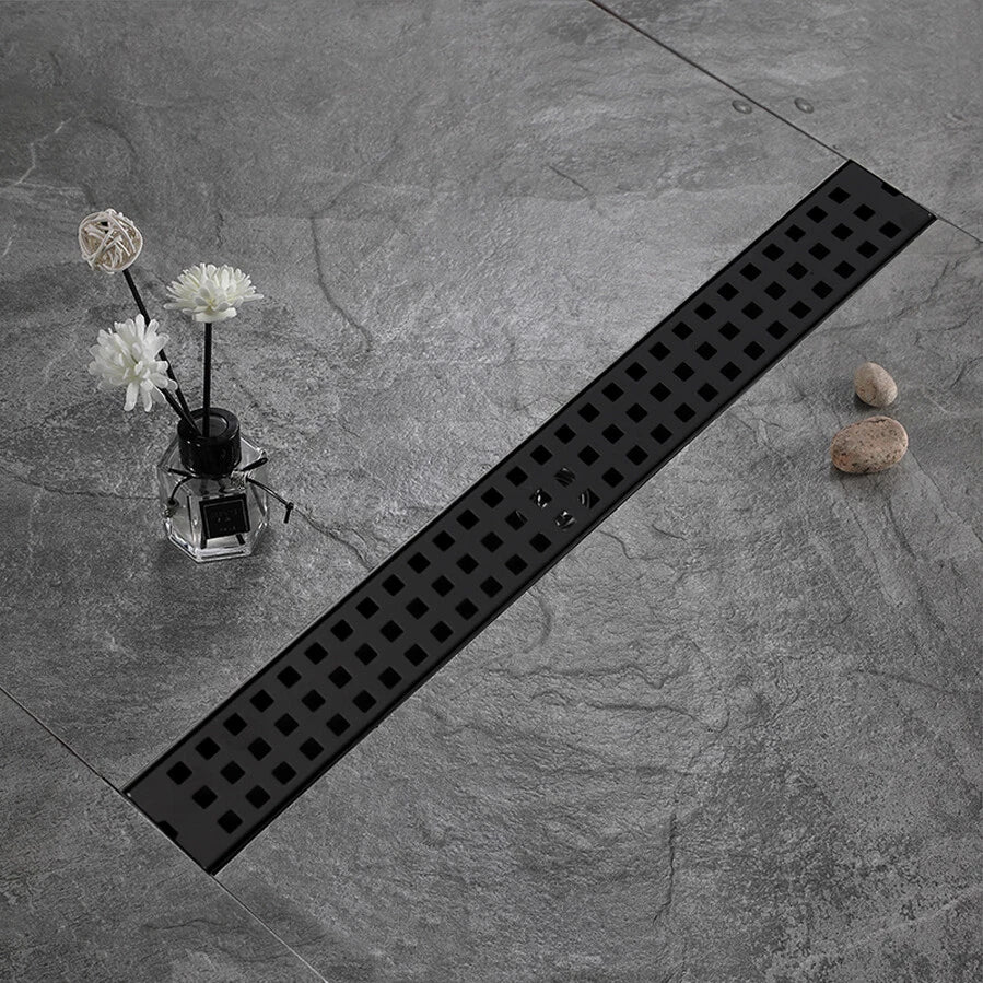 De subtiele vierkante roosteropeningen zorgen voor een gelijkmatige waterafvoer en een minimalistische look die perfect past bij zwarte douche- en kraanaccenten.